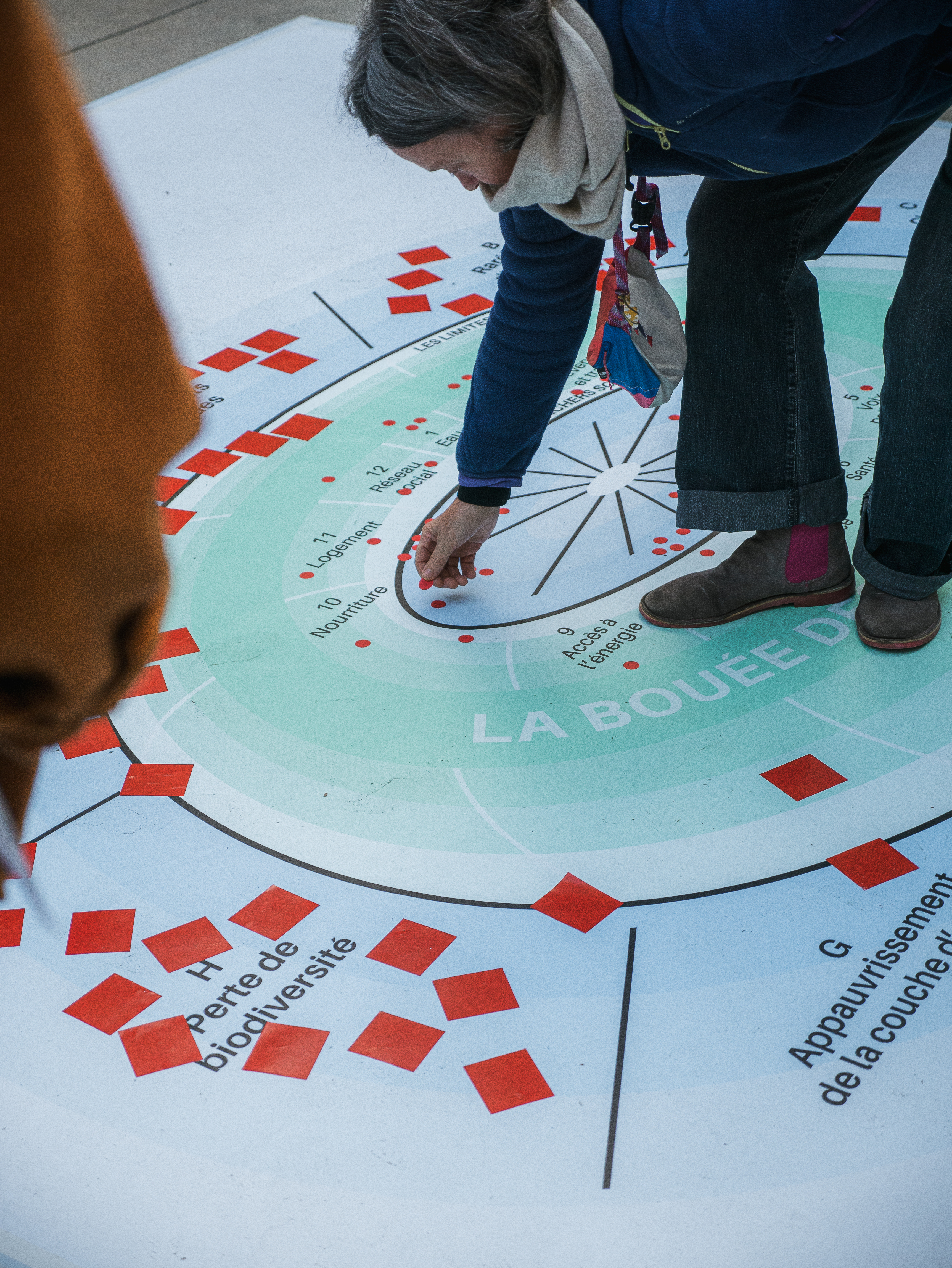 Où se situe le territoire de Rennes et alentours au regard des limites planétaires et des planchers sociaux ? C'est la question qui a été posée aux visiteur.euses. Iels ont pu se positionner sur cette bouée des transitions, une fresque participative inspirée de la théorie du donut.